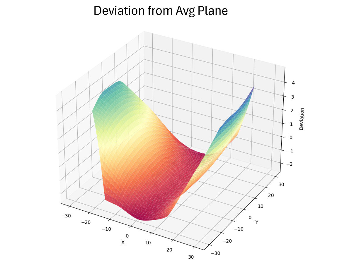 The wavelength deviation of each point to its corresponding point on the average plane is plotted: