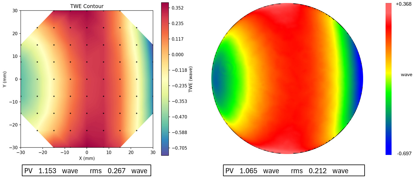The same part was then measured using an interferometer. A measurement clear aperture of 68.5 mm provided a direct comparison with the analytical wavelength-shift derived TWE estimate.