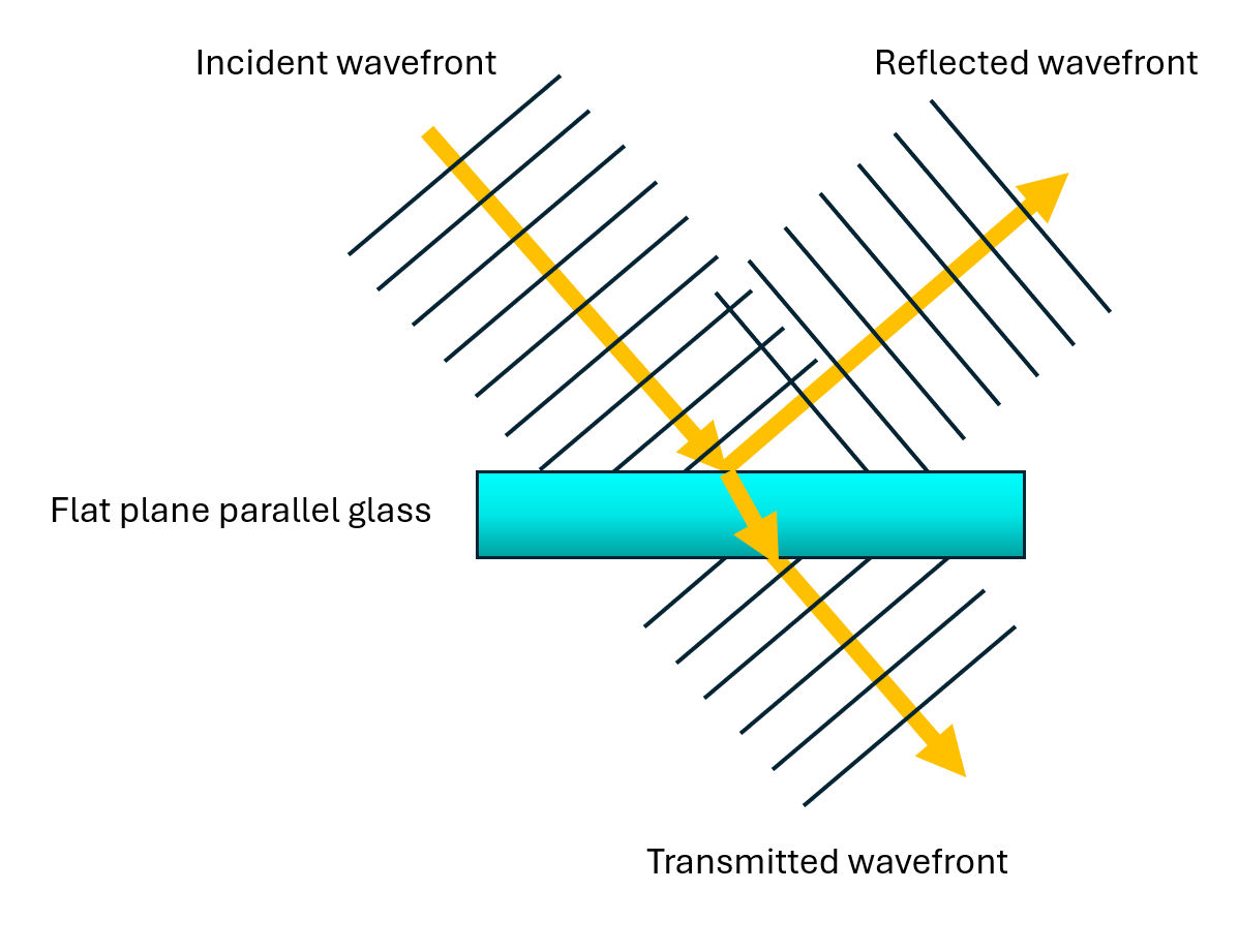 Figure 1a. Light beam wavefront transmitted and reflected by a perfectly flat plane parallel transparent substrate.
