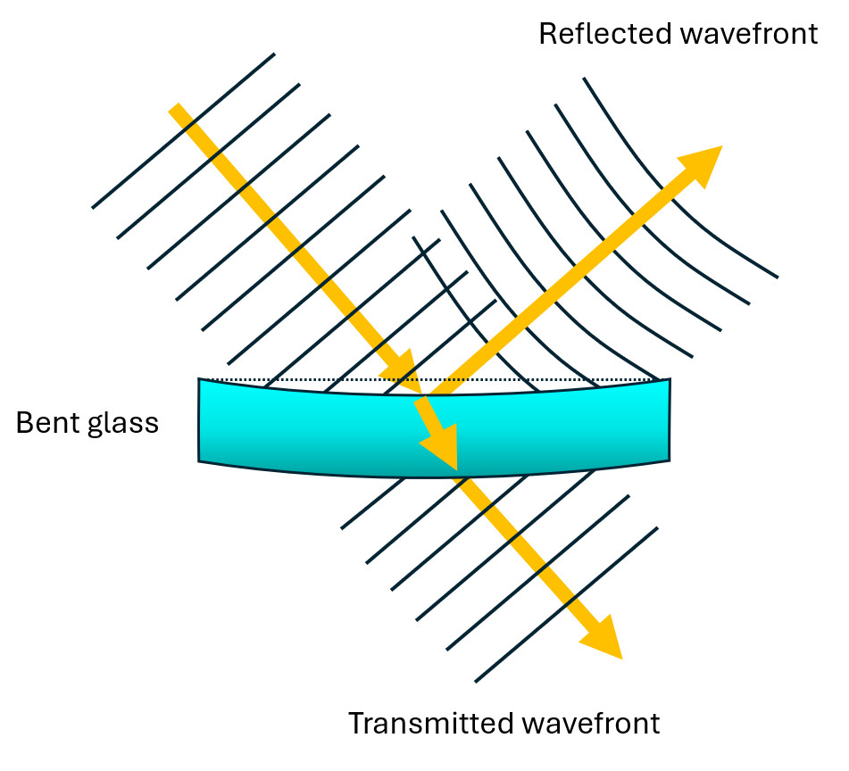 Figure 1b: Light beam wavefront transmitted and reflected by the same glass substrate after bending introduces curvature to the surfaces.