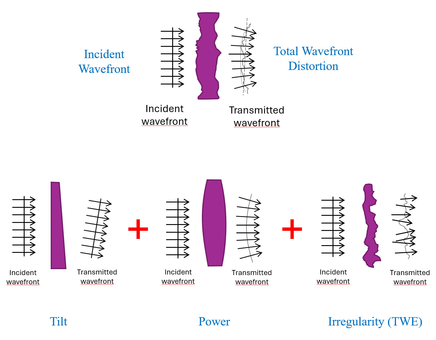Figure 2: Total wavefront distortion is the sum of piston, tilt and power components in addition to irregularity.  TWE always includes irregularity and sometimes power but rarely piston or tilt.