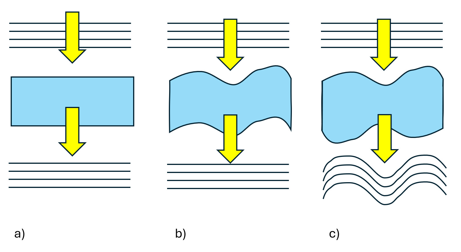 Figure 3. Transmitted wavefront distortion for a) flat substrate, b) substrate non-flat in the same way on both sides, c) substrate with the same non-flat top and bottom surfaces as in b) but with the bottom surface flipped.