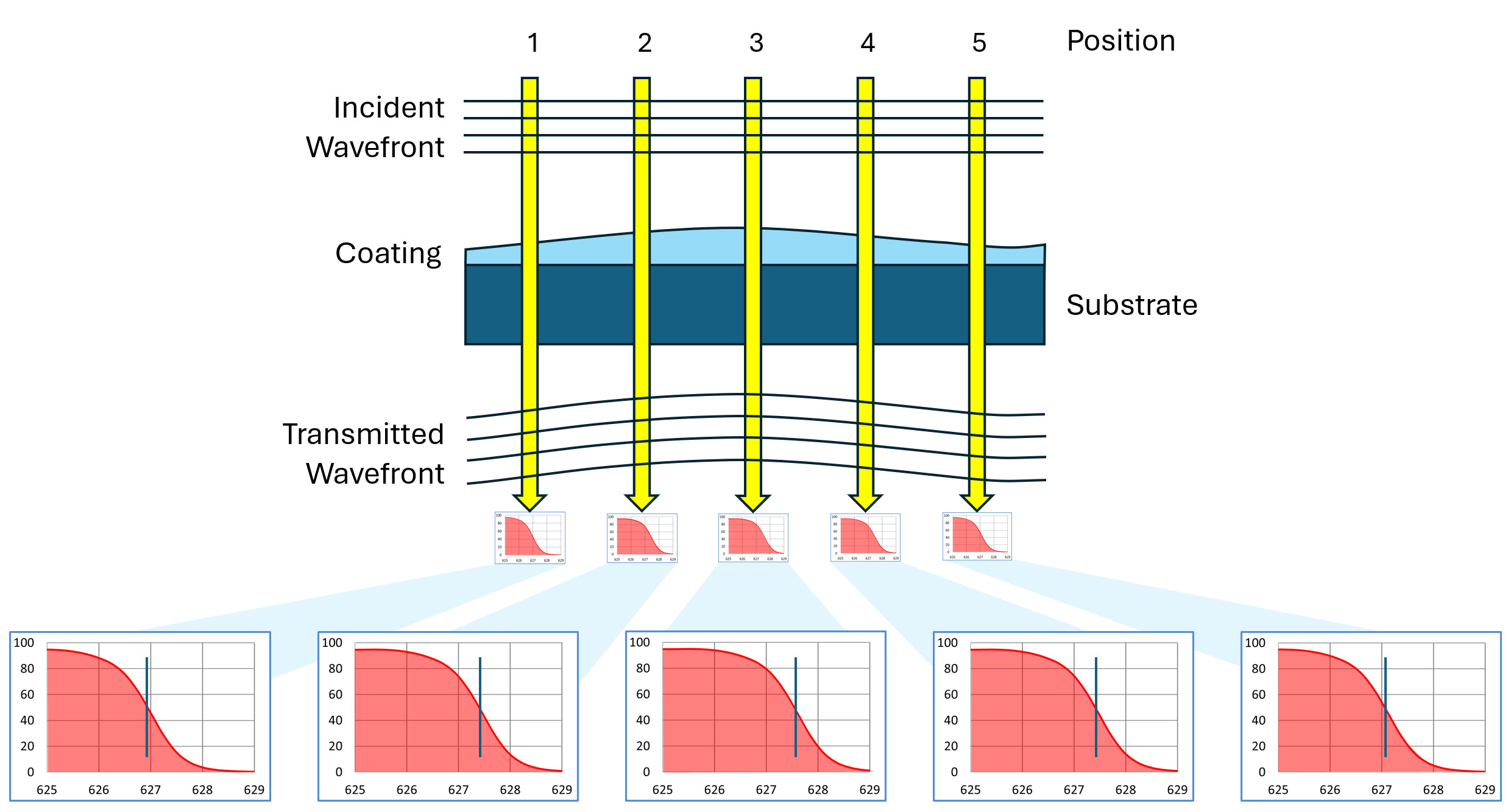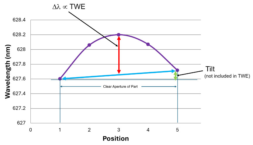 Once the integrity of the spectral shape is determined, the process to calculate TWE can be summarized as follows. A spectrophotometer or a laser/detector system measures a specific or unique spectral feature (such as a 50% edge or peak wavelength) at multiple points across the aperture. These measurements are plotted in the form of wavelength shifts as shown in Figure 5.