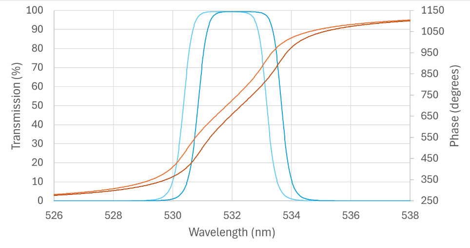 Figure 6. Transmission amplitude and phase for a 532nm bandpass filter. The two curves are identical filters but with a difference in thickness of 0.1%. This results in a phase change at 532nm of about 65 degrees for the wavelength shift of ~0.49 nm shown.