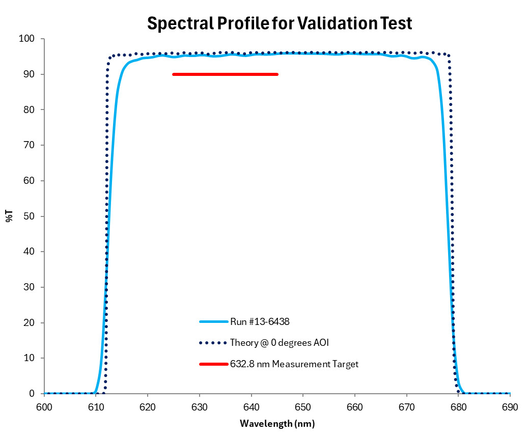 To validate the model, a 3” diameter substrate with tightly controlled TWE was pre-measured to characterize the surface error sans coating. A custom thin-film bandpass filter was designed with a threefold objective: to optimize transmission at the Zygo Verifire’s 632.8 nm measurement line, to contain an easy-to-reference feature such as an edge, and to maximize the phase wavelength factor. The design was deposited on the pre-characterized substrate with the result showing a wavelength dependence seen in Figure 7, with the goal of producing measurable non-uniformity across the part.