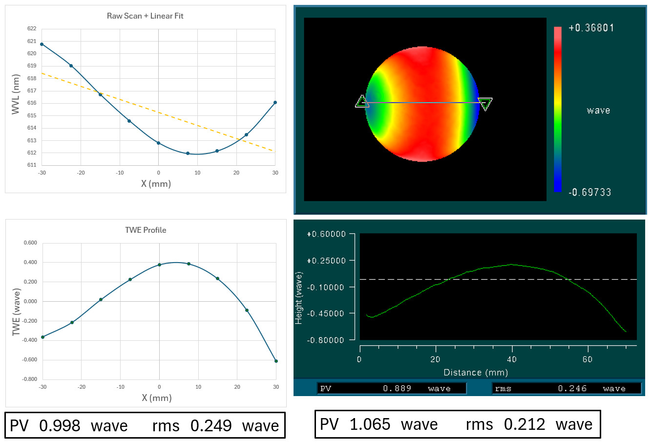 On the right side of Figure 8, the empirical phase change across the part measured by the interferometer is shown both as a heat map and a selected cross-section. The left side depicts the transmission measurements of the 50% edge wavelengths of the bandpass along with a simple linear fit to the data. The linear fit allows a tilt-correction of the raw data. The resulting values are then multiplied by the phase wavelength factor, obtained from the design software, to determine the final TWE values.